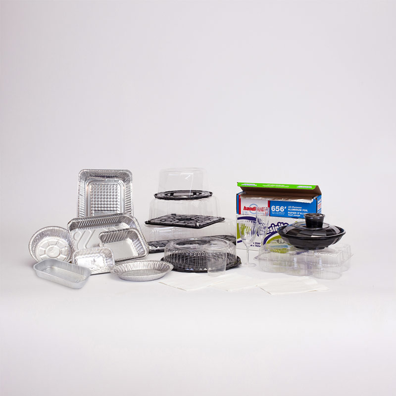 Aluminium pans, containers for cake, takeout and catering, foil rolls, pop up sheets, rigid plastic bowls, trays, two piece containers, plastic wrap, baking sheets, disposable cutlery, drinking cups, napkins, straws, coffee stirrers and more.